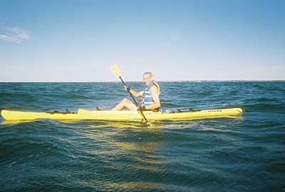 Preparation: A round-trip kayaking trip between Connecticut and Long Island should not be taken lightly. We knew that proper preparation would mean for both a safe and enjoyable paddle across the sound. First of all, we needed a place to launch from and a place to land on Long Island's north shore. We considered a launch from Old Saybrook, but that would mean paddling over Long Sand Shoal. Depending on the tide, the shoal can produce strong currents and large wave heights making for a hazardous paddle. A friend and colleague of ours, Ernie, who we refer to as "Mission Control", worked out the logistics for our trip. He suggested launching from the Sound View section of Old Lyme. He also found a nice beach to land at in the Mulford Point section of Orient by using the satellite view in Google Earth. As it turned out, Orient is due south of Old Lyme; our trip bearing would be 180° true. The marine forecast determined the day of our paddle. The NOAA web site, www.noaa.gov proved to be a valuable resource for us. Their site provided tides and currents, air and water temps, wind speed and wave heights. All were factors in determining the day of our paddle. Equipment: Todd provided the kayaks. We each used a 15'7" Hydra Adventurer open deck kayak. For safety, we brought life jackets, whistles and flashlights, and of course, plenty of Gatorade and Power Bars. To navigate to our Orient destination, Glenn brought his Garmin GPS. The Paddle: The round-trip paddle would be 15.5 nautical miles over open water. Our adrenaline was flowing and confidence high as we put our kayaks in the sound. The morning brought sunshine, light winds and glass-like water. These ideal conditions did not last long though. About a mile away from shore, and all the way across, we encountered increasing wave heights due to a persistent, stiff wind out of the northeast. We estimated wave heights reaching 3 to 4 feet during our paddle. The waves pushed us around and caused for a considerable amount of extra paddling to stay on course. We had to work hard just to stay in the kayaks! As we approached Orient, it was a welcome sight being able to make out houses that dotted the hills that overlooked the shore line. The Orient Point Lighthouse was to our east and just beyond the lighthouse was Plum Island. We landed on a rocky beach in Orient after 3 hours and 10 minutes into our journey. We rested and did a little exploring before starting out on the return trip to Old Lyme. The 3 hour return paddle turned out to be very enjoyable. The wind had subsided and the wave heights were less than a foot. We did get a little anxious when we notice a huge ship, still miles from us, heading in our general direction. The ship turned out to be the Ocean Crystal, an imposing 740' bulker that passed a few hundred yards in back of us. I'm sure they never saw us. Kayakers: Glenn Forest from Branford, CT Todd Strickland from Madison, CT -- Trip contributed by Glenn Forest |