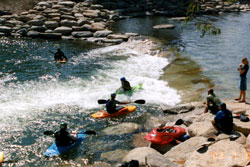 Nevada - Paddle Trip: A whitewater paddling trip of 1 - 4 hours. Nice open views of trees and brush on banks. Through Idilwild park and whitewater course of downtown some quiet stretches and mild rappids. Launch: Mayberry Park, Reno, Nevada. Route description: Put in at Mayberry park (picknic benches & tables, BBQ, restrooms. Easy launch, small sandy beach. Some tricky passages of about 2 feet drops, one 3.5 ft wave just below i.e East of the Hilton casino. Worst spots are at Galletti Way (big rocks) and about 1/4 mile down river from there (waterfalls/rappids). Several take out spots for picnics at Mayberry overpass, McCarran Park (before overpass), Oksbow, Idillwild park, Wingfield Park, Fisherman's Park,Rock Park, Glendale Park, Cottonwood Park (Spice Islands) That's plenty of action. Past this point the banks are steeper and muddy, but some go on to Mustang which is another 4 to 5 hrs Safety Tips: Best to WEAR a life jacket and store an extra paddle. Paddling tips: The Truckee river is ok from March to November but the waterlevel varies presenting different challenges. for practice and beginners there is the Sparks Marina a great lake to relax and paddle the usually smooth water take outs and rest stops. All get-out places mentioned above are ok depending on the water level. A higher level may cover the sandy beaches Comments: We did this trip in inflatables and hard body kayaks Some tense moments made it exiting and some quick manuvering is required -- Contributed by Michael Binkhurst For more information see City of Reno website |